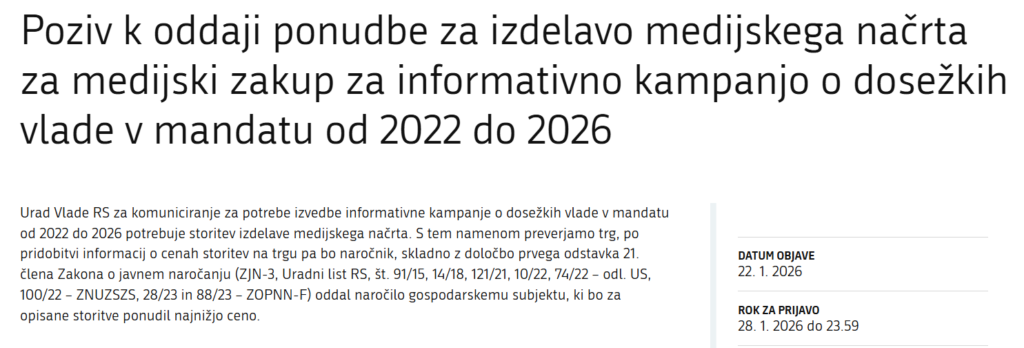 Za 16 odstotkov je vlada ta teden povišala minimalno plačo, objavila pa je tudi razpis za načrt medijske kampanje reklamiranja uspehov vlade s 40.000 evri. To oglaševanje uspehov bo potekalo med 9. in 18. februarjem 2026. Tik pred začetkom uradne volilne kampanje. Če se vam zdi, da gre tu za zlorabo javnega denarja v času pred volitvami za plačevanje kampanje za vladne stranke, imate povsem prav. Še ena od odvratnih zlorab v vrsti.
