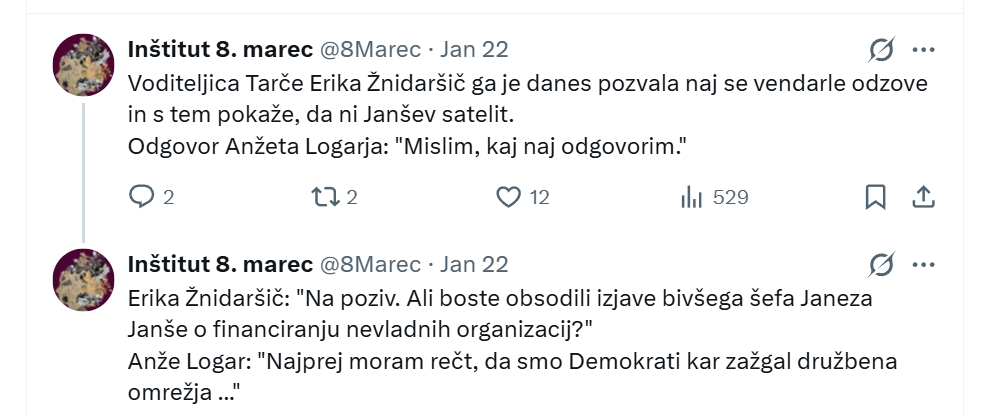 Hkrati so vladne stranke po družabnih omrežjih s pomočjo svojih “ljudskih sil” sprožile kampanjo, kako grda opozicija nasprotuje temu, da bi najslabše plačani dobili več denarja s povišanjem minimalne plače. Čeprav opozicija pri tem ni imela čisto nobene besede. Državni proračun za letos, v katerem povišanje ni predvideno, so potrdili vladni poslanci v parlamentu. In torej so bili oni proti temu povišanju. In ne opozicija. Povišanje mimo proračunskih načrtov, ko denarja ni, a ga bodo razdelili, pa je določila vlada, v kateri opozicija nima predstavnikov. Tudi, če bi iz opozicije to želeli, ne morejo glasovati proti. A pri nas je mogoče lažnivo podtakniti karkoli. Smo država umetnosti lažnivih spinov in sumljivih akterjev, ki se razglašajo za ljudstvo ali ne vladne organizacije, ustanovili pa so jih politiki, plačani so za politične kampanje, s politični spini in manipulacijami pa za vladne politike poskušajo določati tok medijskih razprav. In to jim uspeva v medijih, kjer so si vladne stranke s čistkami nastavile svoje direktorje in urednike ali ki so v lasti vladnim strankam naklonjenih tajkunov, ki jih vlada financira. Ti mediji potem zahtevajo, da morajo Anže Logar (ali Janez Janša ali kdo tretji) pojasnjevati politični aktivistki Niki Kovač, kako so politično na pravi strani. Aktivistki, ki vodi zavod, ki ga je ustanovil Simon Maljevac, v mandatu te vlade pa so se mu prihodki povišali za več kot tisoč odstotkov. O tem, kako podrejena jim je voditeljica Tarče Erika Žnidaršič, ki ji določajo, kako mora spinat, se v 8. marec celo javno pohvalijo: