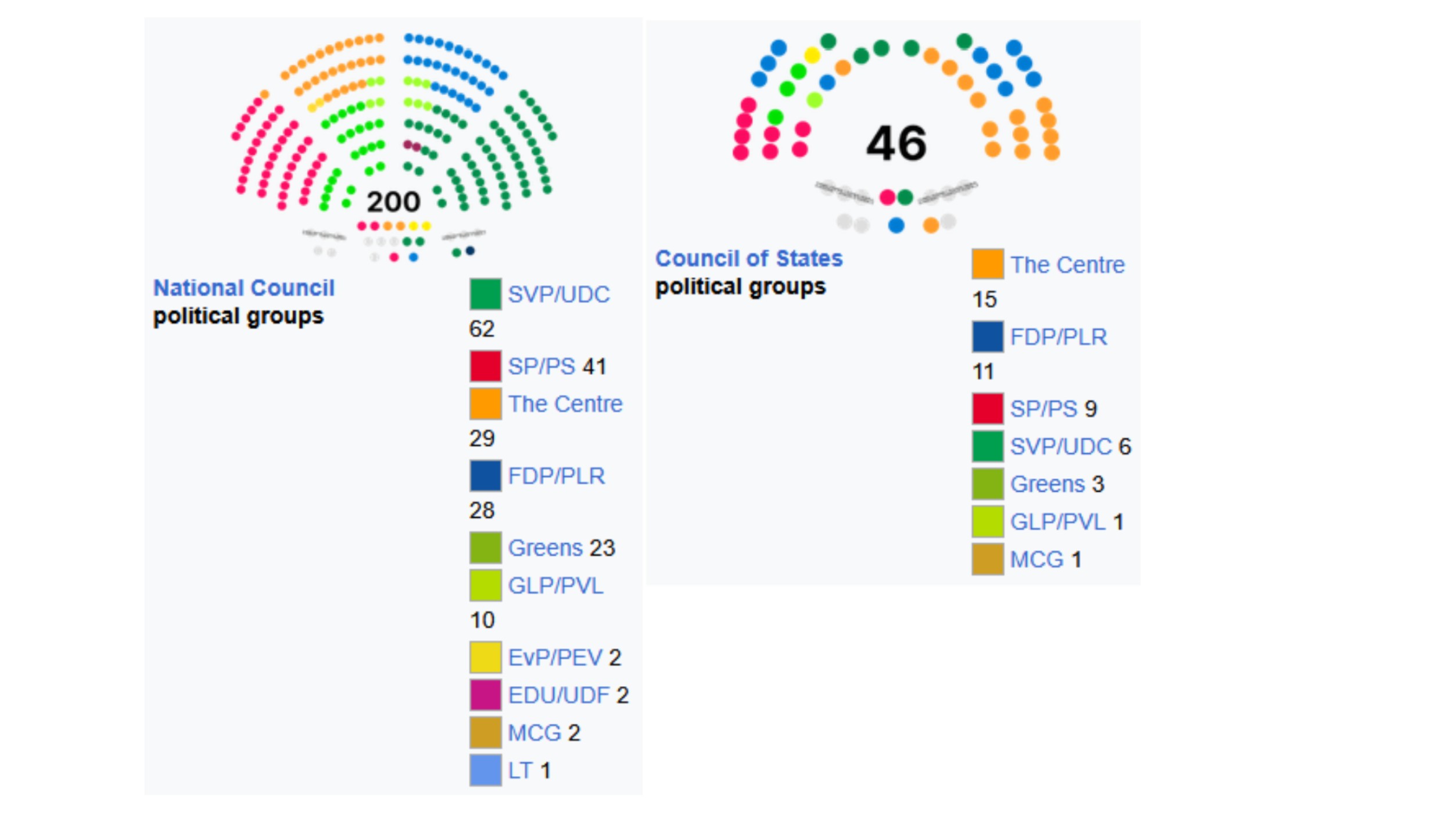 Volitve v Sloveniji se bližajo z nezadržno hitrostjo. Slovenija je po katastrofalnem mandatu ekstremno levega Roberta Goloba pripravljena, da obrne nov list v svoji zgodovini. Golob je predsednik vlade in seveda zato tudi kolovodja te procesije levih zmešancev, ki Slovenijo rinejo nazaj na Balkan. Vendar pa ni bil sam v tem. Ne pozabimo, da je Golob pustil, da mu vlado vodijo Levica/Vesna, brutalni nasilnjaški »nevladniki« ob podpori izkušenih postaranih levih ekstremistov, a la Tanja Fajon, iz SD. Ko pogledamo mandat Goloba dejansko vidimo, da ni šlo za nobena trenja v vladi ampak je šlo za simbiozo med levimi ekstremisti, ki so na začetku mandata v to godljo poskušali zvabiti NSi zato, da bi izgledali bolj državniško. Ko jim to ni uspelo, se je seveda razkrila celotna njihova narava. Zaradi česar je Golob tako zelo jezen na NSi. Vendar pa od življenja v preteklosti še nihče ni uspel dobro živeti v sedanjosti, zato si poglejmo kako bi v trenutnem stanju Slovenije volili Švicarji, če bi lahko videli slovensko politično krajino z očmi Slovenca in ne na podlagi olepšanih informacij, ki se jih ta zavržna leva ekstremistična vlada na vse kriplje poskuša razširjati v tujini. Švicarski parlament je podobno kot parlament ZDA dvodomen. Spodnji dom je dom v katerem sedijo predstavniki ljudstva. Zgornji dom, senat, je dom v katerem sedijo predstavniki kantonov. Spodnji dom je voljen po mešanem proporcionalno/večinskem sistemu. V njem je 200 poslancev in zanimivo, nimajo minimalnega praga za vstop v parlament, oziroma stranka mora zbrati vsaj 0,5%, za enega poslanca. Zadnje volitve v Švici so bile oktobra 2023, sestava parlamenta pa je naslednja.