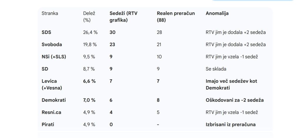 To, da slabo poročanje o raziskavi, ki sproži številne špekulacije, pojasniš tako, da direktorica agencije pove, kaj vse so sploh merili, a je medij to pozabil povedati gledalcem, ni ravno profesionalni odziv, ki bi ga pričakovali od medija, ki ga moramo vsi plačevati. So se pa opravičili vsaj, ker so v grafikah SDS pripisali 30 in 29 sedežev. Oboje ni mogoče. Razen, če bi že spet upoštevali različne deleže, česar pa ljudem niso povedali, tudi za to stranko. Matematični prikaz razlike v sedežih, po obeh načinih, ki ga je pripravil AI Gemini, je takšen: