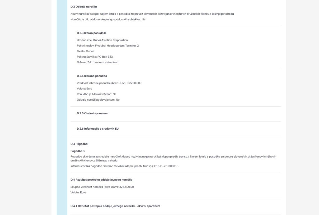 - Vrednost posla: Fiksnih 325.500 evrov za najem letala s posadko.