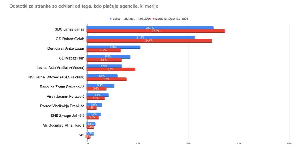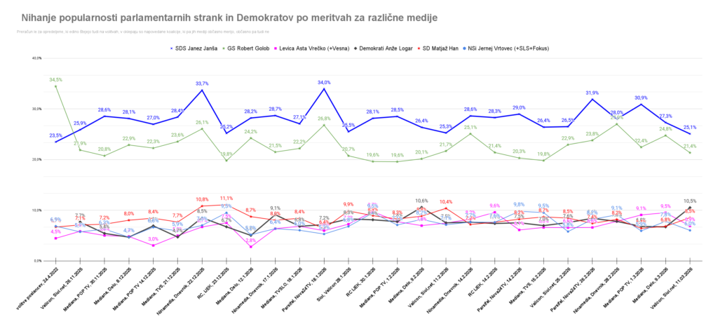 Opozorilo: Meritvam javnega mnenja ne smemo verjeti. Povsem so zgrešile ob obeh zadnjih referendumih in na evropskih volitvah. Vsakič, to je trikrat zapored, so udarile mimo v prid zdaj vladnih strank. Na prejšnjih volitvah poslancev pa so tudi udarili mimo, a v obratno smer. Podcenili so Svobodo. Na volitvah štiri leta prej pa SDS. Za večino podjetij, ki izvajajo merjenja (Ninamedia, Mediana, Valicon) za večje medije, je znano, da so poslovno in politično povezani z vladnimi strankami. Bolj na desno sodita Parsifal in RC IJEK.