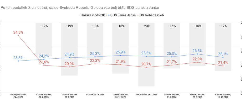 Dejansko meritve Valicona ne kažejo, da bi bili SDS in Svoboda vse bolj ali skoraj izenačeni. Pregled meritev Valicona za največji stranki v daljšem obdobju je takšen: