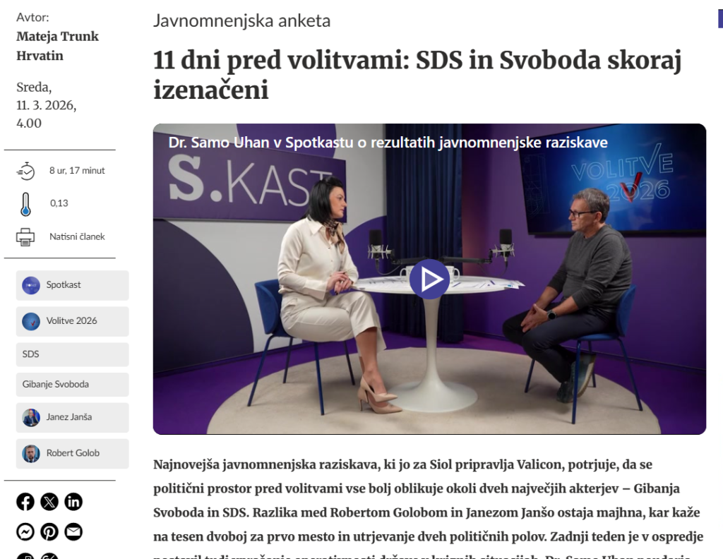 O ugotovitvah raziskovalcev na Siol.net poroča kar prej piarovka obrambnega ministrstva Mateja Trunk Hrvatin, ki so jo po že drugi čistki poslovnega in uredniškega vrha iz obrambnega ministrstva v ta državni medij prerazporedili za novinarko, ki piše o vladi v kateri je bil prej v službi. Zadnjega pol leta ves čas sporoča, kako sta SDS in Svoboda vse bolj izenačeni. Dejansko sta bili ti stranki bolj izenačeni po zadnji meritvi Mediane za Delo pred dvema dnevoma. Cilj je propaganden: ustvariti vtis izenačenosti, da bi volivci z leve volili predvsem Svobodo. Tokrat je naslov članka: “11 dni pred volitvami: SDS in Svoboda skoraj izenačeni.”