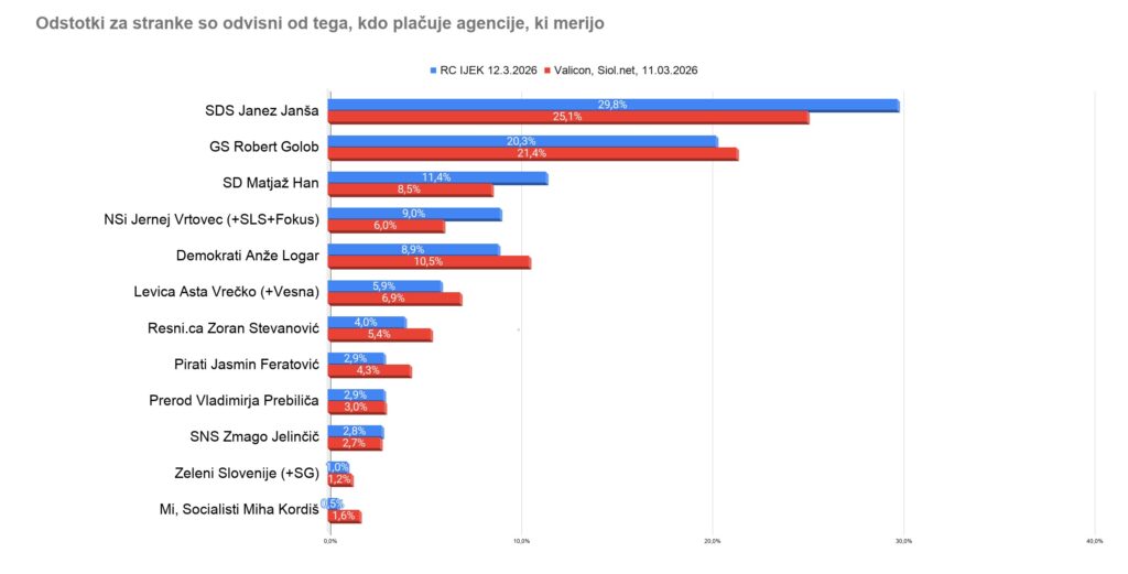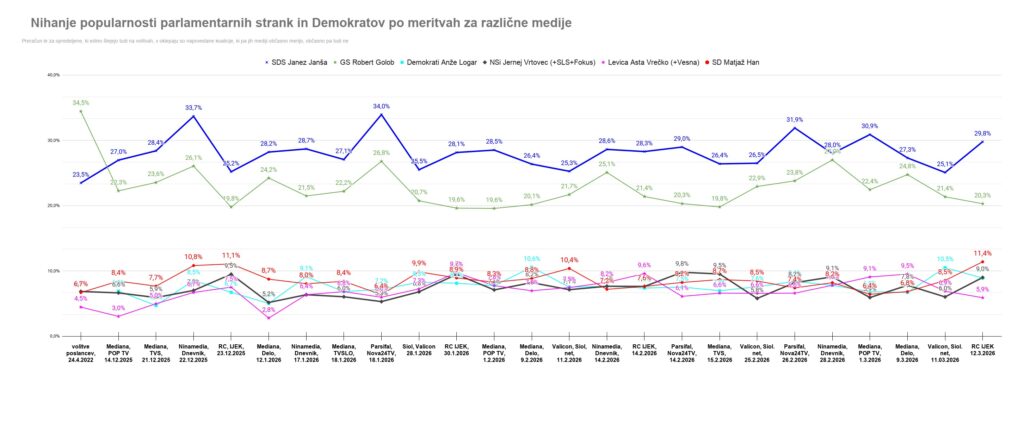 Raziskava Utrip družbe, ki jo je med 1. in 10. marcem 2026 izvedel Raziskovalni center IJEK kaže, da se vladnim strankam Svoboda, SD in Levica obeta hud poraz, a SDS in NSi (+SLS in Fokus) sami brez Demokratov ne bosta mogli sestaviti vlade. Demokrati pa hočejo v koaliciji še največjo levo stranko. Kar bo pa težko, ker te tradicionalno zavračajo sodelovanje s SDS kot daleč največjo zmerno desno stranko. To bi pri takšnem rezultatu lahko zelo zapletlo sestavljanje vlade po volitvah.