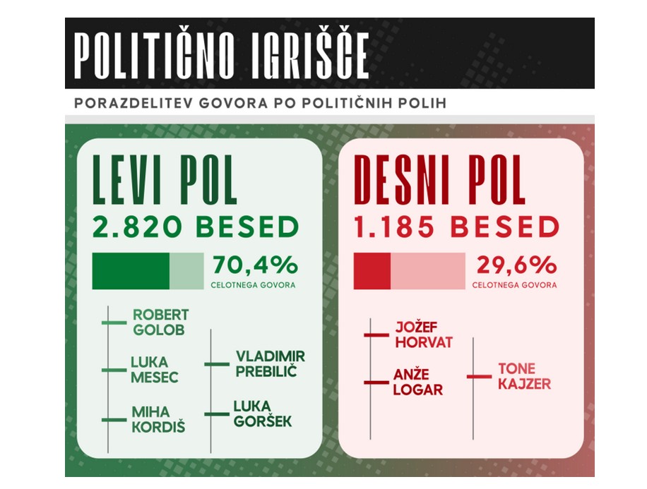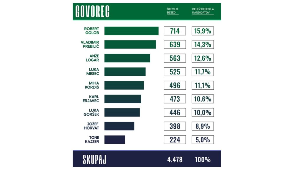 Brez upoštevanja Karla Erjavca so kandidati levega pola (Robert Golob, Vladimir Prebilič, Luka Mesec, Miha Kordiš in Luka Goršek) skupaj izrekli 2.820 besed, kar predstavlja dobrih 70 % vsega govora med preostalimi kandidati. Desni pol (Anže Logar, Jožef Horvat in Tone Kajzer) je s skupno 1.185 besedami zavzel preostalih slabih 30 % razprave, kar kaže na precejšnjo številčno in časovno prevlado levosredinskih govorcev v tem soočenju. Dinamika vodenja je bila izrazito nagnjena v korist levega pola, saj je voditeljica Manica Janežič Ambrožič levim kandidatom (Golob, Prebilič, Mesec, Kordiš, Goršek) namenila skupaj 18 neposrednih vprašanj in spodbud k repliki, medtem ko je desni pol (Logar, Horvat, Kajzer) prejel le 9 usmerjenih vprašanj. Ta dvakratna razlika v pozornosti voditeljice se neposredno odraža v besednem deležu. Posledično je leva stran na vsako besedo desnega pola odgovorila z razmerjem 2,4 : 1, kar kaže, da je bila desnica zaradi redkejših vprašanj potisnjena v izrazito defenzivo in vsebinski rob soočenja.
