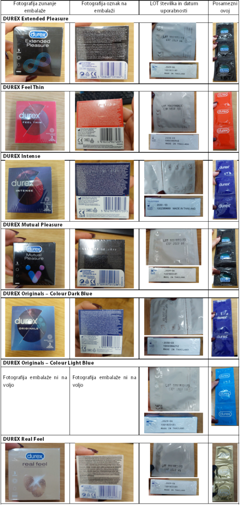 | Medicinski pripomoček | DUREX Extended Pleasure DUREX Feel Thin DUREX Intense DUREX Mutual Pleasure DUREX Originals – Colour Dark Blue DUREX Originals – Colour Light Blue DUREX Real Feel |