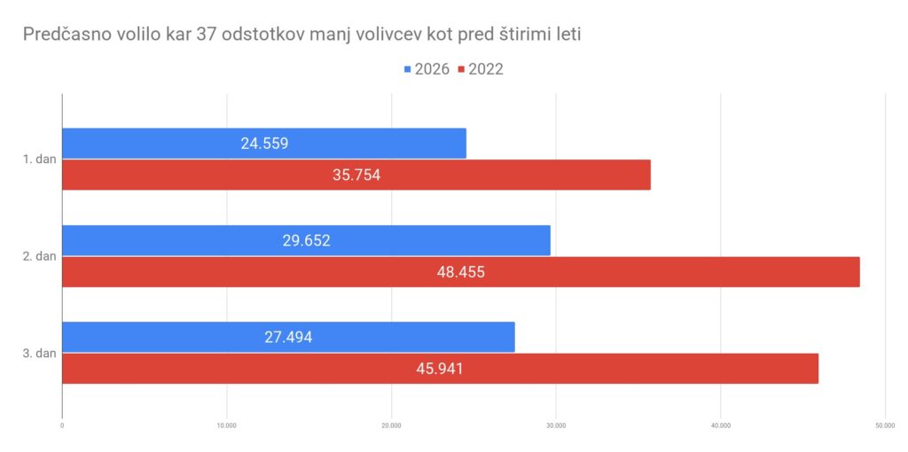 | Dan predčasnega glasovanja | Volivci 2022 | Volivci 2026 | Upad v odstotkih |
