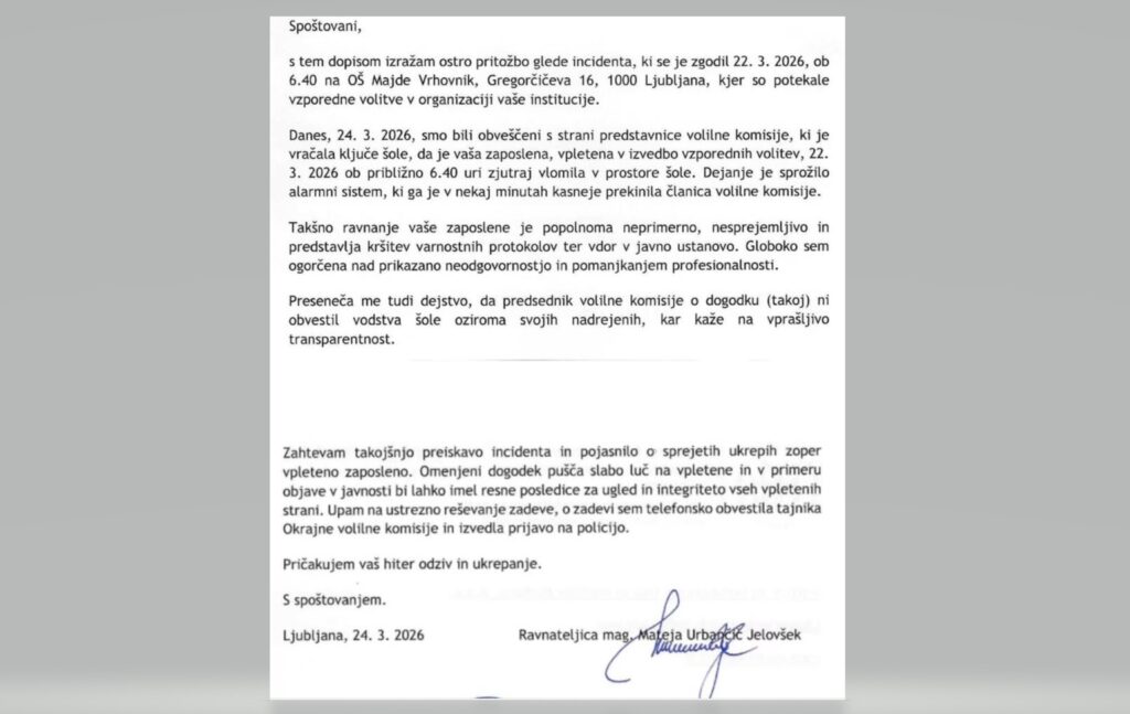Prejel sem dopis ravnateljice Osnovne šole Majde Vrhovnik, ki razkriva nenavaden incident na dan volitev, ki se je zgodil v prostorih šole, kjer so potekale volitve. Ravnateljica Mateja Urbančič Jelovšek v dopisu vodstvo agencije Mediana sooča z dejstvom, da so njihovi sodelavci vlomili v šolo in sprožili alarm in s tem grobo kršili pravila in varnostne protokole, o čemer so šolo obvestili člani volilne komisije, ko so vračali ključe. Dopis je tak: