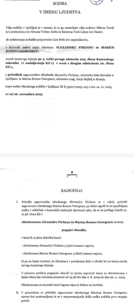 Okrožno sodišče v Ljubljani je žeparja iz Romunije Alexandra Piriiana in Mariusa Romeo Georgescuja, ki sta delovala usklajeno na avtobusu ljubljanskega mestnega prometa, obsodilo na pet mesecev in štiri mesece zapora, oba pa tudi izgnalo iz države. A je višje sodišče, senat je vodila Milena Turuk, sodili pa sta še Silvana Vrebac Arifin in Katarina Turk Lukan, konec lanskega leta sodbo spremenilo v pogojne obsodbe, Romunoma pa je tudi odpravilo izgon iz naše države. Piriiana in Georgescuja sta se na sojenju zagovarjala, da sta v Slovenijo prišla le “turistično”, policija pa ju je prijela, ko sta na avtobusu mestnega prometa uporabila zvijačo: prvi je s prerivanjem ustvaril gnečo in žrtvi odvrnil pozornost, drugi pa ji je medtem neopazno iz nahrbtnika izmaknil denarnico z gotovino in dokumenti. A spregledala sta kamere, ki so njun “profesionalni” podvig posnele in policista v civilu.