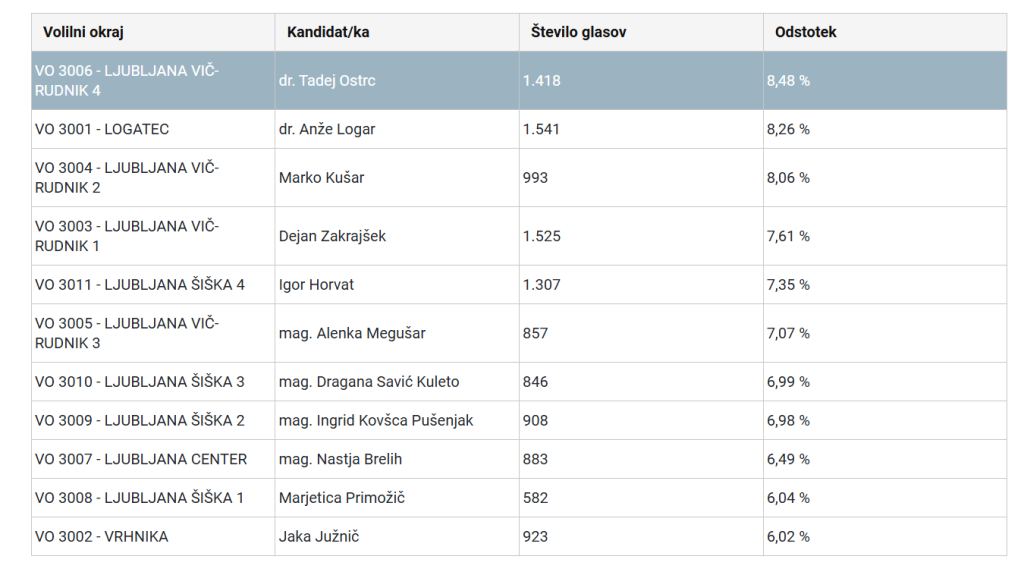 Logarju je do vstopa v parlament zmanjkalo le malo in odhod Ostrca v vlado bi mu zagotovil nadomestni sedež, ki bi ga pa avtomatično izgubil, če bi bil Ostrc kot minister odstavljen ali če bi vlada padla. Rezultati Demokratov v Logarjevi volilni enoti so bili takšni: