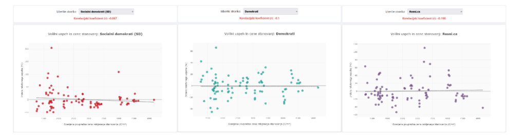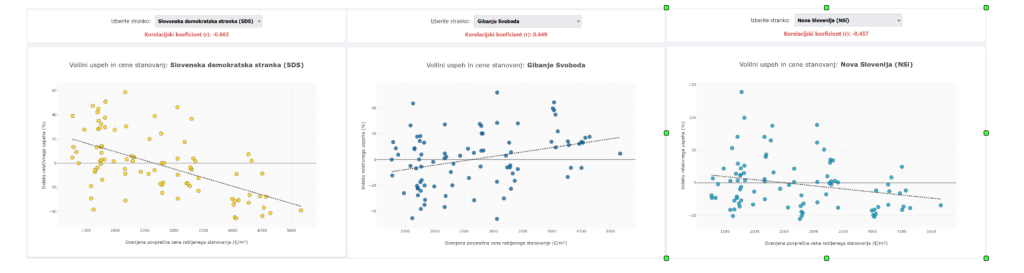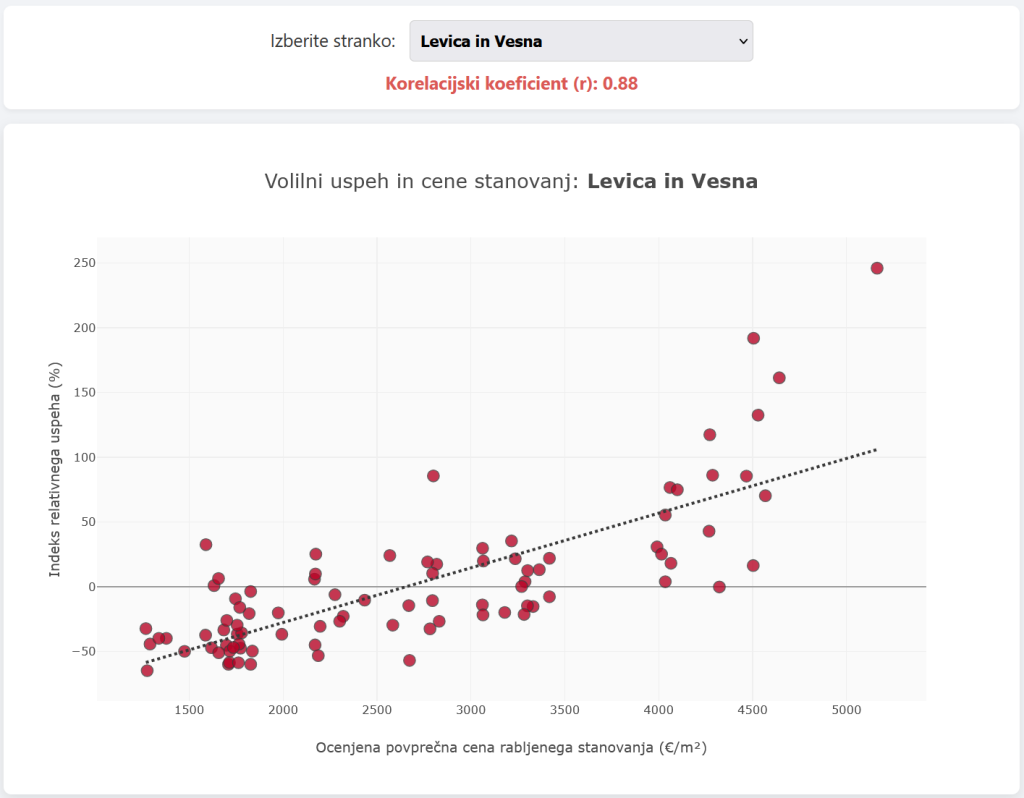 Izmed vseh strank oz. list le ena izkazuje visoko korelacijo med ceno stanovanj in volilnim uspehom: Levica in Vesna. Višja ko je cena kvadratnega metra v okraju, dramatično višja je njena podpora. Pearsonov koeficient korelacije (r) znaša kar 0,88, kar v statistiki pomeni močno linearno odvisnost.