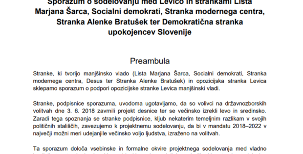 Sporazum o sodelovanju med Levico in strankami Lista Marjana Šarca, Socialni demokrati, Stranka modernega centra, Stranka Alenke Bratušek ter Demokratična stranka upokojencev Slovenije Preambula Stranke, ki tvorijo manjšinsko vlado (Lista Marjana Šarca, Socialni demokrati, Stranka modernega centra, Desus ter Stranka Alenke Bratušek) in opozicijska stranka Levica sklepamo sporazum o podpori opozicijske stranke Levica manjšinski vladi. … Nadaljujte z branjem Temelj, ki danes zagotavlja izvolitev: Sporazum šestih strank